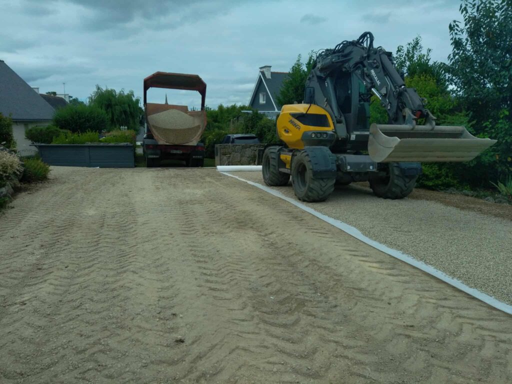 Nous réalisons vos allées, entrées de garage et chemins carrossables, avec une base bien compactée et des matériaux adaptés : grave, concassé, enrobé ou stabilisateur.